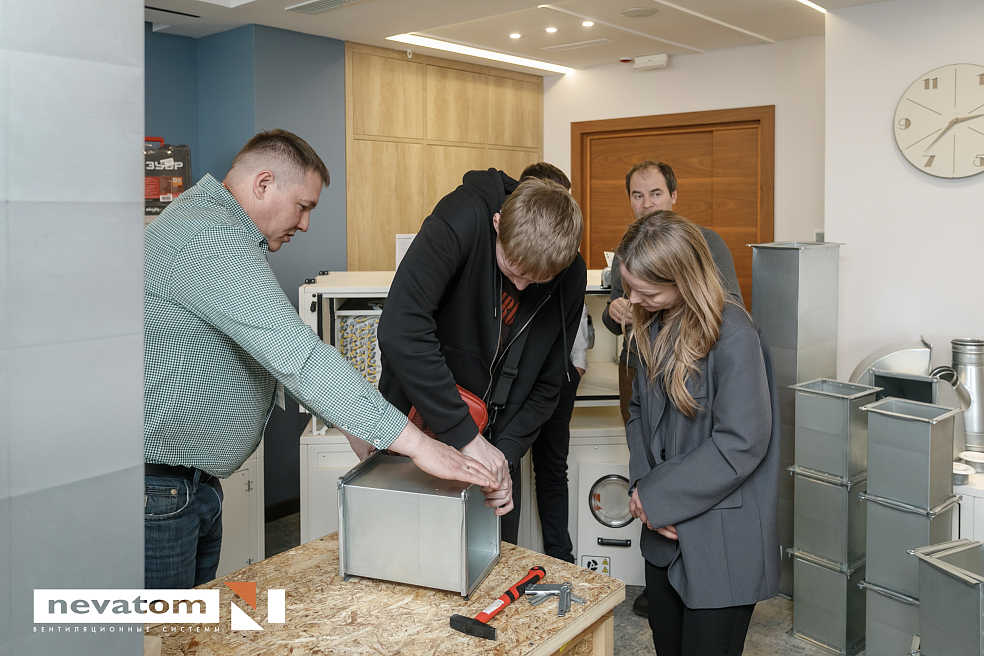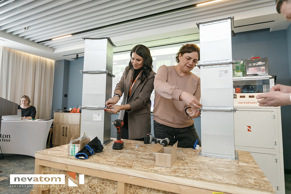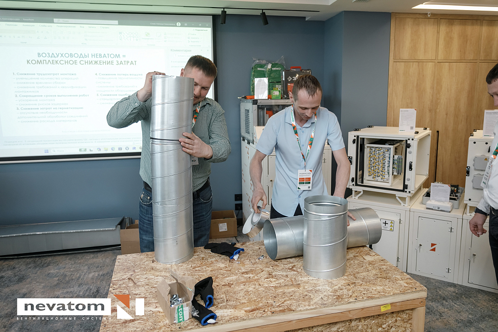 Во второй части программы мы представили доклад по воздуховодам и фасонным элементам. Рассказали о преимуществах воздуховодов на интегрированном фланце TDC, возможностях NEVATOM System, а также о новых решениях и производственных разработках компании. Финалом блока стал интерактив — мастер-класс в формате соревнования по сборке L-образных воздуховодов и не только. Тут, честно говоря, включился азарт — и теория быстро перешла в практику.