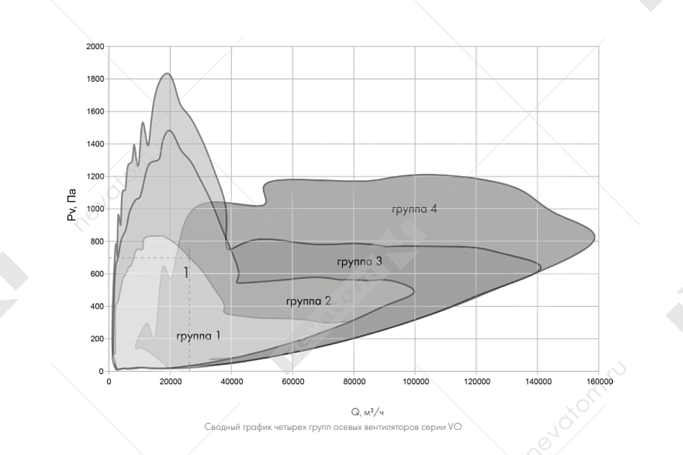 Для системы с производительностью 25 000 м³/ч и полным давлением 710 Па подойдут установки типоразмеров №7,1 и №8,0 первой группы. Конкретный вариант выбирается по графикам рабочих характеристик в зависимости от требуемого КПД и мощности двигателя.
