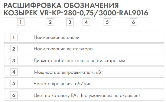 Предназначены для защиты вентилятора от атмосферных осадков при уличном размещении. Тип козырька определяют в зависимости от угла поворота спирального корпуса вентилятора.